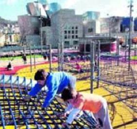 Fig. A. Parque Infantil, Bilbao, España. Ubicado junto al Museo Guggenheim. Bilbao cuenta con 90 parques infantiles, todos seguros y con suelos a prueba de caídas, esparcidos en los distritos y barrios. Descripción: Parque con