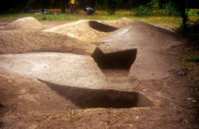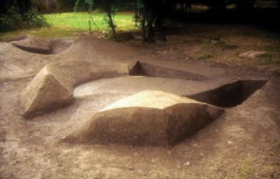 6.3-Hito Paisajístico. Fig. A. Hito paisajístico en el parque de la Facultad de Artes de la Universidad de Chile. Intervención efímera de volúmenes y texturas de barro sometida a la incidencia del clima, del tiempo, y del uso cotidiano del lugar. Descripción: Composición escultórica, land art, intervención creativa estética y artística. Ubicación: Espacios residuales,