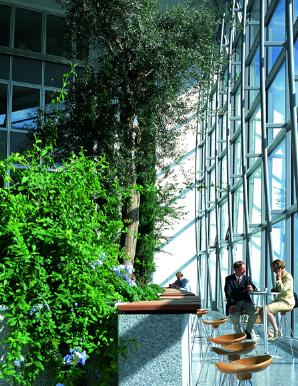 6.4-Micro Paisaje Interior. Fig. A. Micro paisaje interior, Commerzbank, Frankfurt, Alemania, Norman Foster. Descripción: Introducción de elementos verdes no sólo en los jardines sino al interior de los edificios. Ubicación: Al interior de las